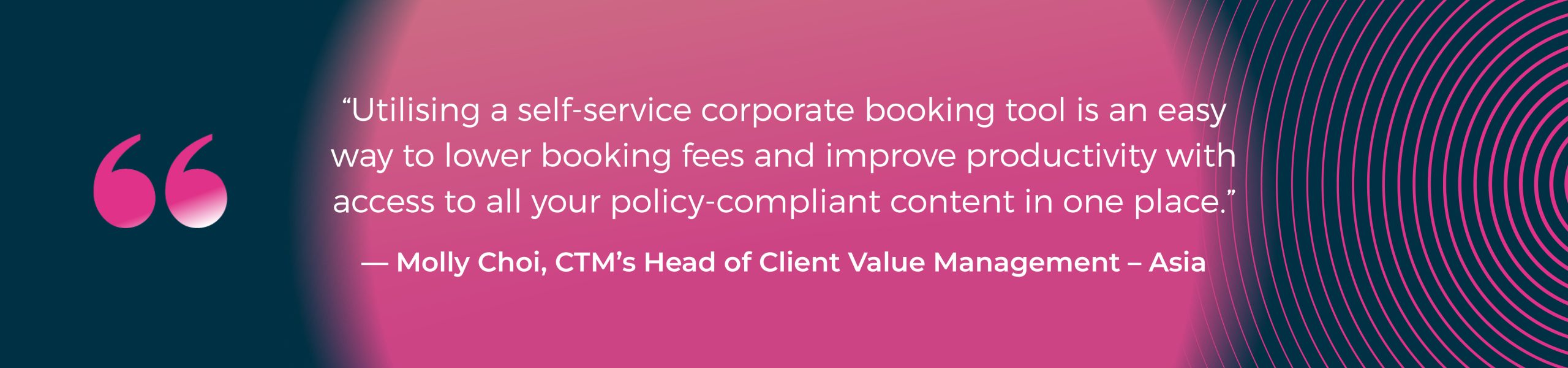 “Utilising a self-service corporate booking tool is an easy way to lower booking fees and improve productivity with access to all your policy-compliant content in one place”, says CTM’s Head of Client Value Management – Asia, Molly Choi.